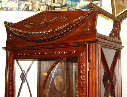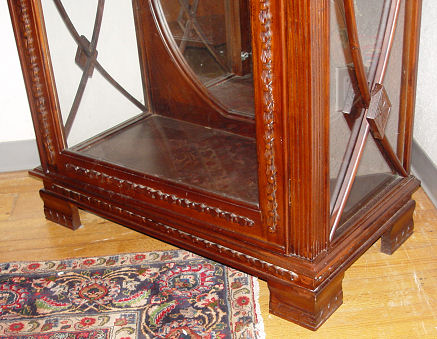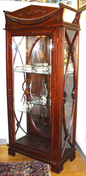 CARVED MAHOGANY CURIO DISPLAY CABINET: Single door, glass front and sides, interior with mirror back and glass shelves. Later 20th C. 82''h. x 34'' x 18''.