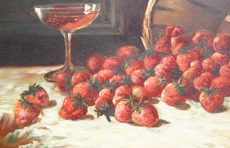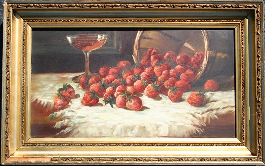 AMERICAN STILL LIFE PAINTING OF STRAWBERRIES CIRCA 1900: 10'' x 18 1/2'', period worn gilt frame, 14'' x 22''.