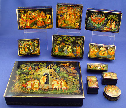 COLLECTION OF 11 RUSSIAN LACQUER BOXES: A fine collection, each hand painted in a most detailed mythical scene. They artist signed, dated and come in original boxes with certificates. The largest is 10 1/2'' x 7 3/4'', the smallest is 1 1/2'' x 2 1/2''. Each about 1 1/2''h.