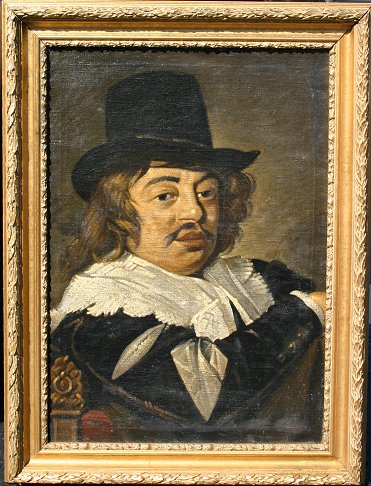 19th C O/C PORTRAIT OF MAN IN TOP HAT: Probably Dutch, 28'' x 20'', newer frame with wear, 34'' x 26''.
