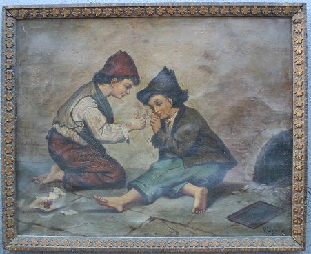 GENRE PAINTING OF KIDS SMOKING: Late 19th/early20th C., 16'' x 20 1/4'', SLR R. Dynon.