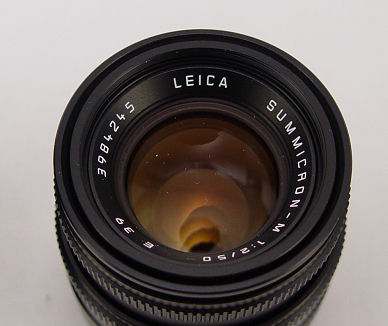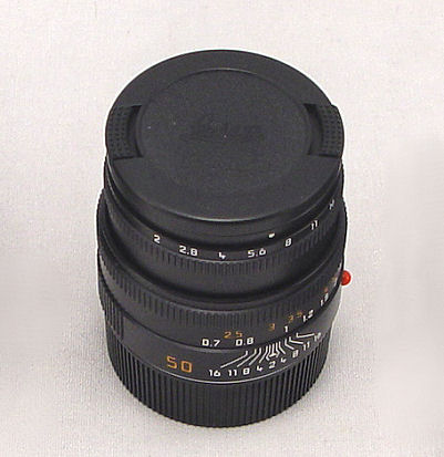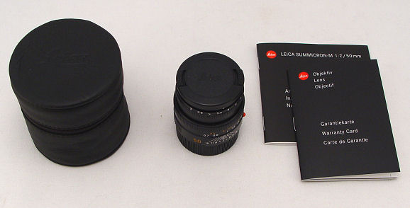 LEICA SUMMICRON CAMERA LENS 50MM E39: Serial number 3984245, all black with chrome lock, both end caps and leather Leica case. Excellent condition.