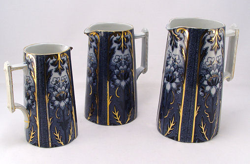 GROUP OF 3 STAFFORDSHIRE FLOW BLUE GRADUATING PITCHERS: With gold accents. The largest being 8'', the smallest 6''.