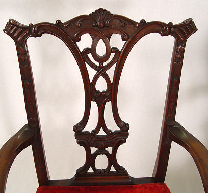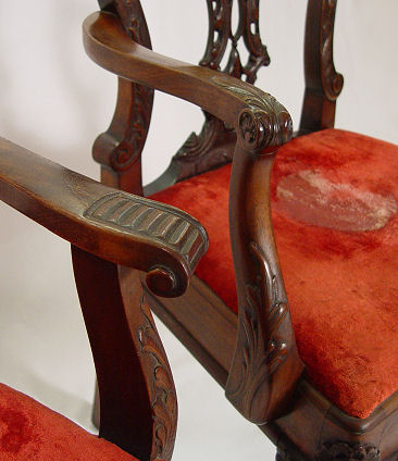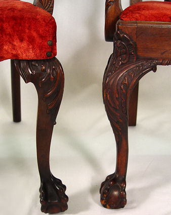 2 CHIPPENDALE CENTENNIAL MAHOGANY ARM CHAIRS: Delightfully different, not a matched pair, both have ball and claw feet. Approx. 39''h. 23'' wide at the seat.
