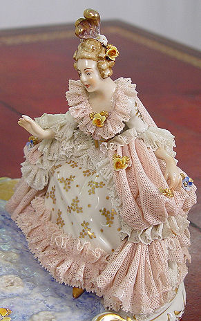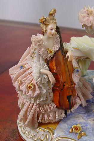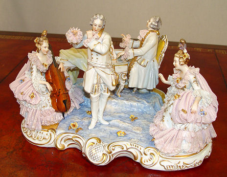 VOLKSTEDT GERMAN PORCELAIN LACY FIGURAL GROUP: Musical grouping of 4 figures. Blue underglaze mark, 8''h. x 13''.