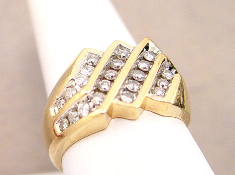 GENTLEMAN'S DIAMOND RING: 26 diamonds of approx. 2pts each channel set in a zig zag pattern, 10k yellow gold mount, size 10 1/2, 6.5 grams.