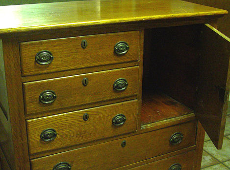 AMERICAN TURN-OF-THE-CENTURY GOLDEN OAK TALL GENTLEMANS DRESSER. Having three short upper drawers and a hat cabinet over three full length drawers, all with brass pulls. Four square blocked legs, conforming rectangular top, paneled sides, dovetailed drawers. 47''h. x 40''w. x 20 1/2_.
