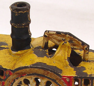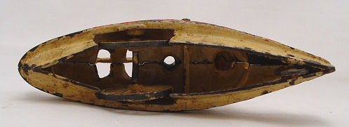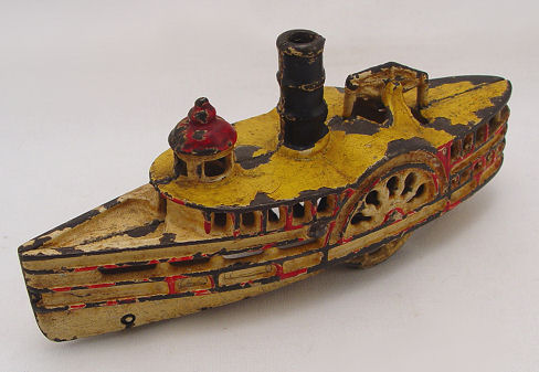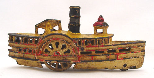 CAST IRON TOY STEAM PADDLE RIVER BOAT: 7 1/2''l., 3''h. Some loss of paint, though they are still bright.