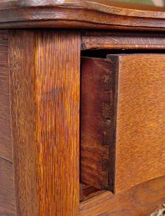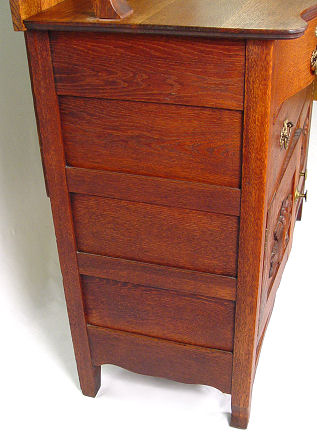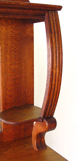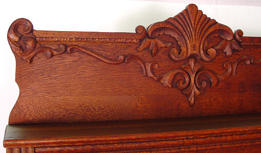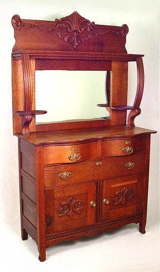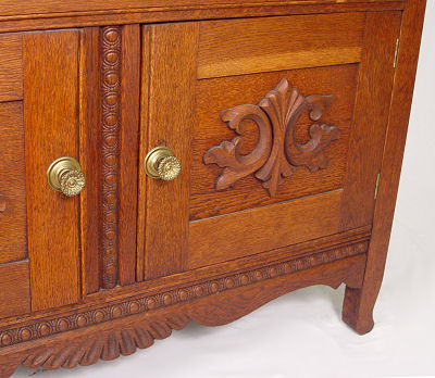 AMERICAN TURN OF THE CENTURY GOLDEN OAK BUFFET CABINET: American, circa 1890 - 1910. Shell and scroll carved pediment over a rectangular back splash flanked by two scroll carved supports with candle shelves. The base with two serpentine drawers over one long drawer and two door cabinet base with applique scroll carved relief. 76 1/2'' h x 44'' x 19''.