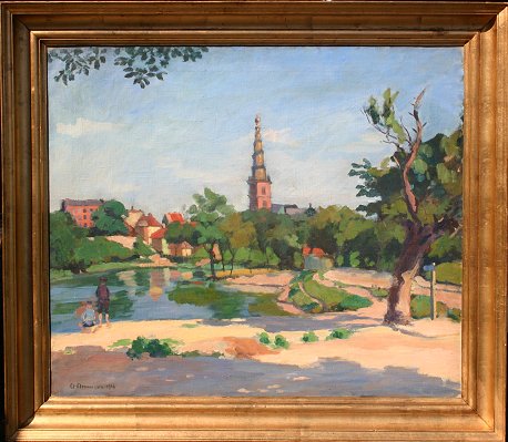 CLEMMENSON, Clemen, (Danish, 1885-): Lakeside Village, O/C, 29'' x 34'', SLL and dated 1916, gilt frame with wear, 34'' x 39''.