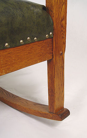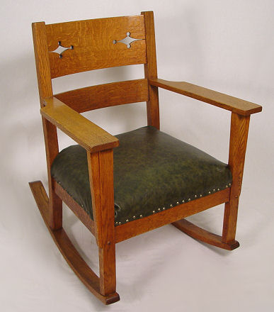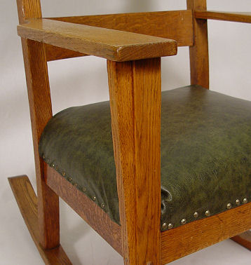 GOLDEN OAK ARTS AND CRAFTS ROCKER: Mission style short back rocker with pierced top slat and arm corbels, spring seat with faux green leather. Very comfortable with good rocking action. 33''h., 21 1/2'' arm, 30 1/2'' rockers, 16 1/2''h. seat.