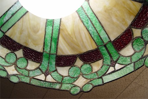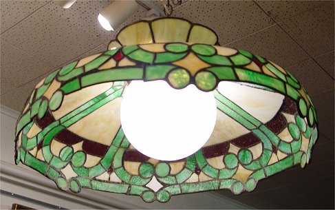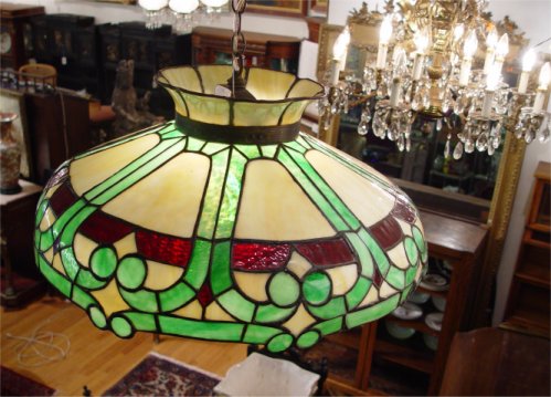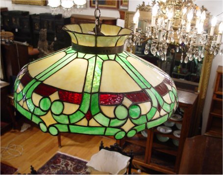 ARTS AND CRAFTS LEADED GLASS HANGING CHANDELIER: Predominate colors of green and red, central white glass globe, approx. 12''h. x 24'' dia.