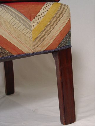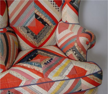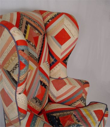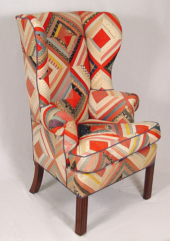 CHIPPENDALE STYLE CARVED AND UPHOLSTERED WING CHAIR. American, circa 1920 - 1940. Upholstered in an actual quilt.