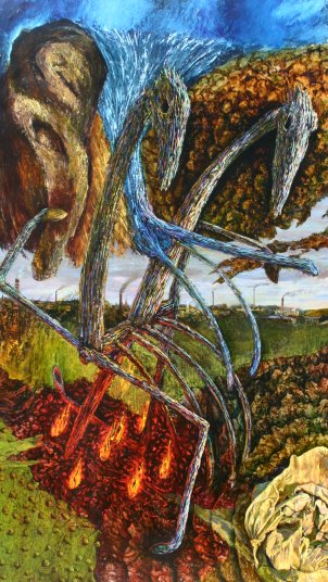 HUDDLESTON, Jarrett, (American, 20th C.): ''Plow'', O/C, 84'' x 48'', titled, signed and dated 1985 verso. Exhibited at the Skowhegan 10 year Retrospective.