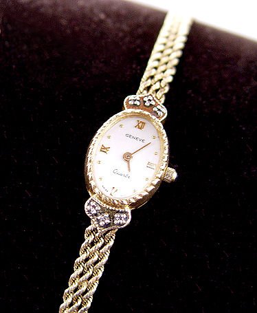 LADY'S 14K GOLD WATCH BY GENEVE: Quartz 5 jewel movement in a 14k yellow gold case, serial #25350, mother of pearl dial, gold hands and Roman numerals, three diamond accents to each lug, melded three strand bracelet with adjustable clasp, 7 1/2''l., 13 grams.