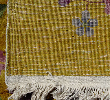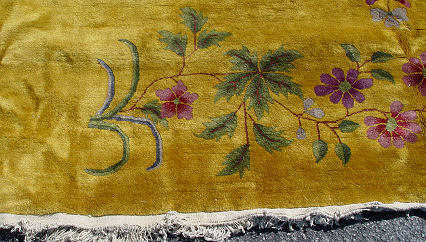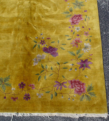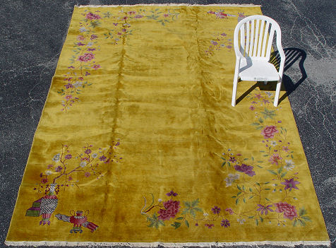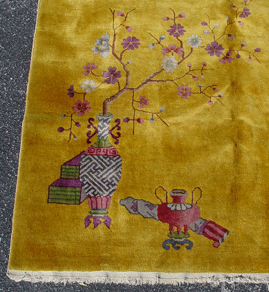 LARGE CHINESE DECO CARPET: Approx. 13'9'' x 9'10'', lovely saffron ground with traditional designs in magenta, cobalt and greens.