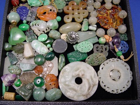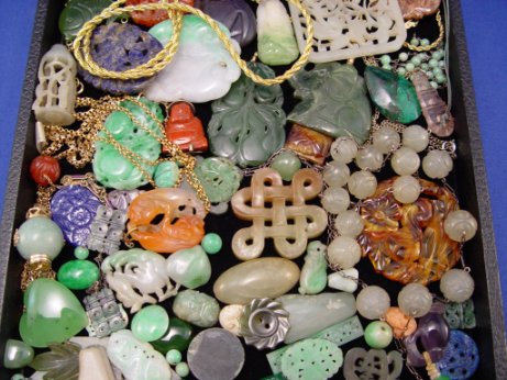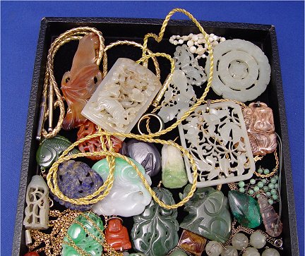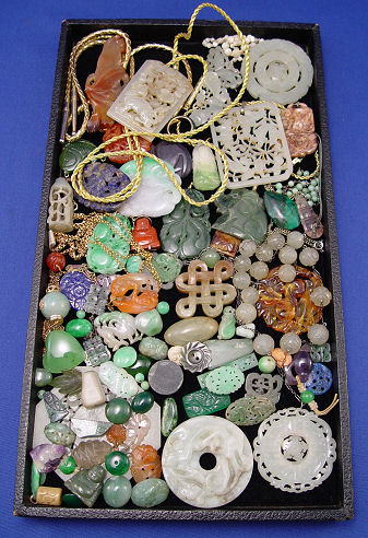 TRAY LOT OF CARVED JADE, CARNELIAN ETC: Featuring some lovely carved jade disks, pendants, bolo slides, pins, 14k ring; lapis?, carnelian, rose quartz, tiger eye etc.