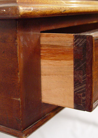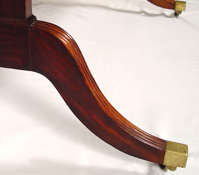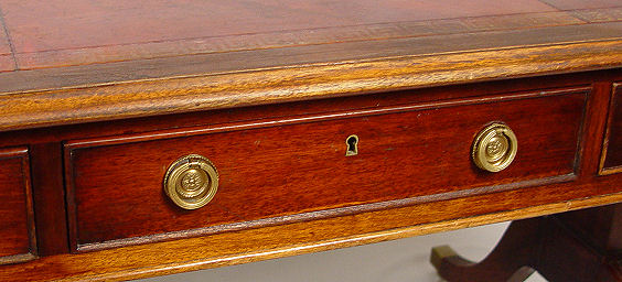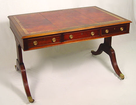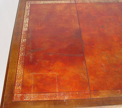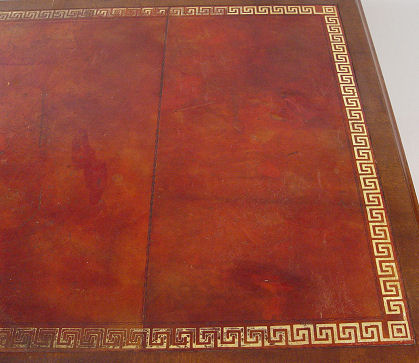 FEDERAL STYLE LEATHER TOP MAHOGANY DESK: Greek key gold embossed leather top, three drawers, double pedestal base with splay legs ending in brass casters. 30''h. the surface is 48'' x32''. Korean label.