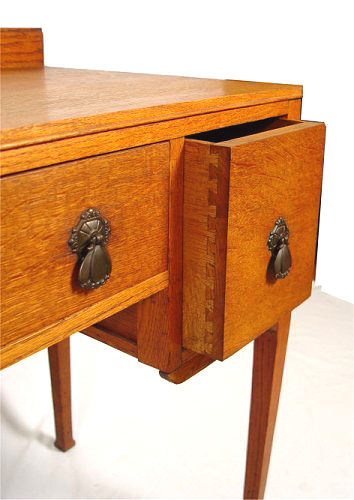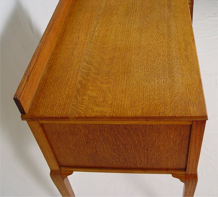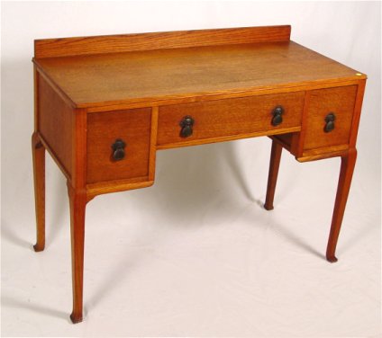 AMERICAN TURN OF THE CENTURY GOLDEN OAK TABLE DESK: American, circa 1890 - 1910. Having one long drawer, flanked by two end drawers, cast brass bell flower pulls, shaped legs. 32 1/2'' h x 41 1/2'' x 19''.