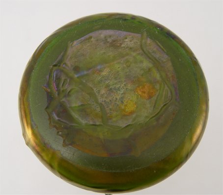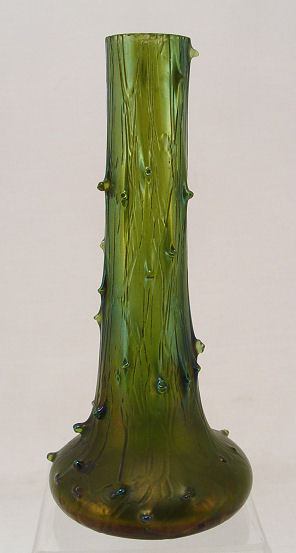 LOETZ IRIDESCENT ART GLASS VASE: Tree bark type glass in iridescent green, 6''h., Minor chips along interior rim.