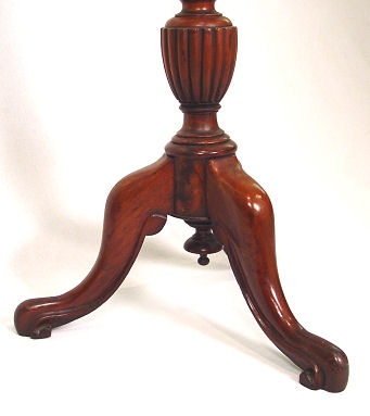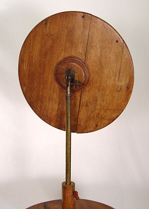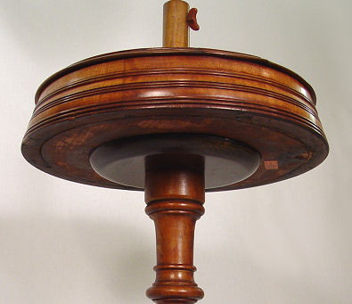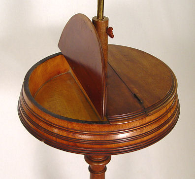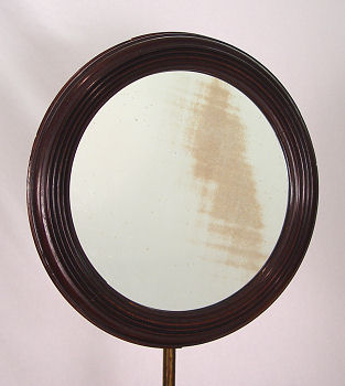 ENGLISH REGENCY WALNUT SHAVING STAND, 19TH CENTURY: Adjustable oval mirror on brass pole, over a drum top with flap openings supported on turned post and tripod base ending in scroll feet. 62'' h x 17 1/2'' dia.