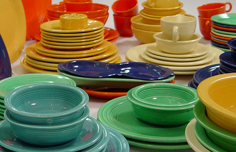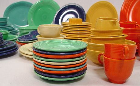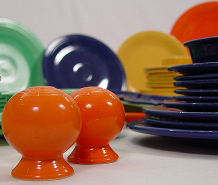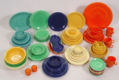 LARGE COLLECTION OF FIESTA WARE: Approx. 74 pieces to include 20 red, 20 yellow, 15 cobalt, 8 ivory, 11 turquoise. Chop plates, serving bowls, bowls of all sizes, cups and saucers, salt and pepper. Please call for detailed list.