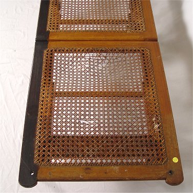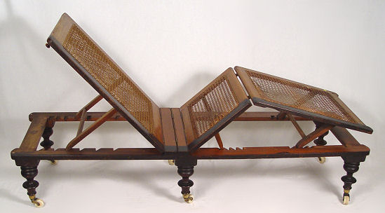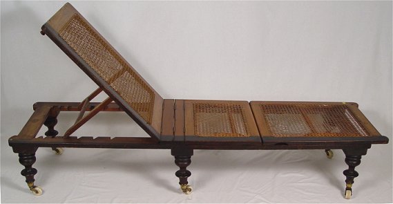 ENGLISH CAMPAIGN FOLDING ADJUSTABLE CHAISE: Labeled Robinson & Sons Yorkshire, dated 1876. Wood frame with caning. Turned legs on scaters. Fully adjustable for back rest and legs. Opens full length at 75''.
