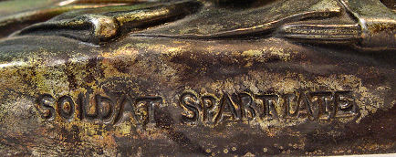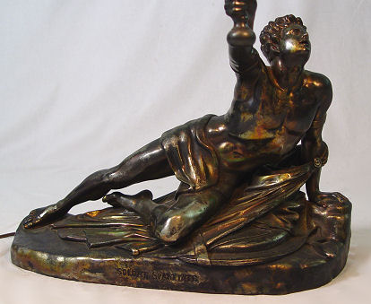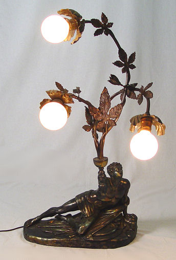 ART NOUVEAU STYLE BRONZED FIGURAL SPARTAN LAMP: ''Soldat Spartiat'' three light lamp. 32''h. x 17''.