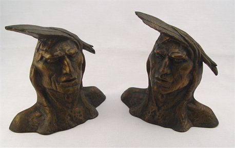 VINTAGE PAIR OF BRONZE FIGURAL BOOKENDS: Native American Indian head full of character. Marked Compliments of Taylor & Doe. 6 1/2''h.