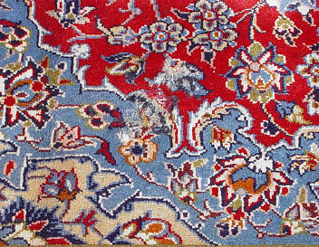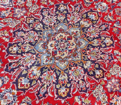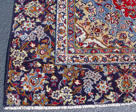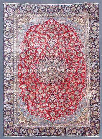 HAND MADE ISFAHAN CARPET: Approx. 12'2'' x 9', red ground, wide dark blue border.