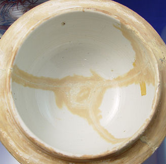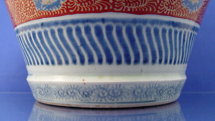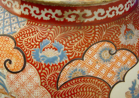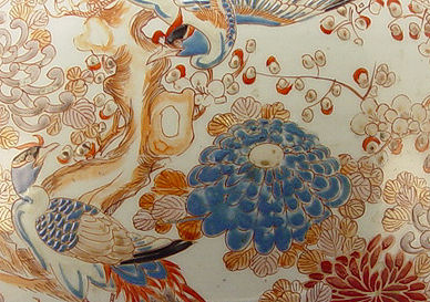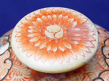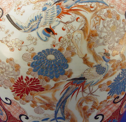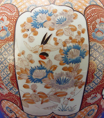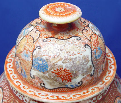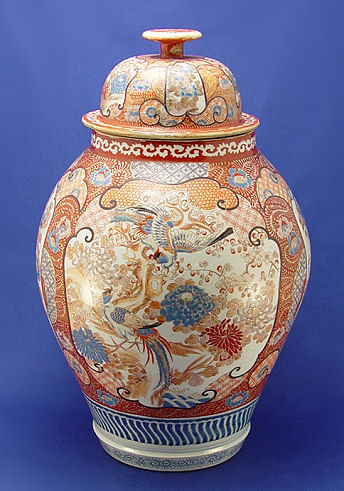 JAPANESE IMARI COVERED JAR: Bird and floral reserves, please note repair to lid. 21''h.