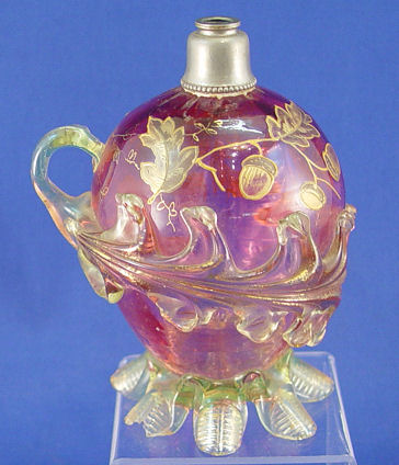 BLOWN GLASS PERFUME BOTTLE: Cranberry bulbous body with applied green leaf feet and decoration ending in handle, gold gilt acorn and leaf design, metal neck with inside threading, 5 1/4''h. Chip to on foot and bottom tip of handle.