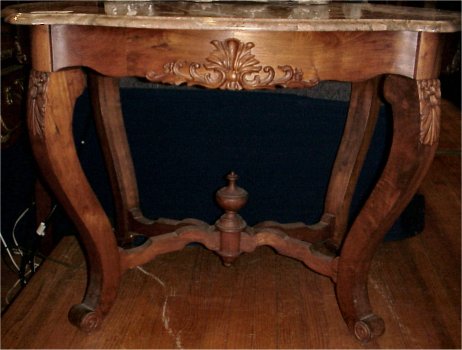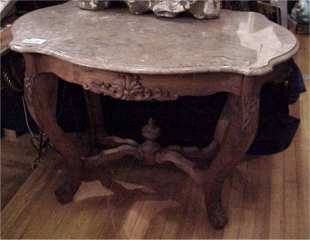 A FINE VICTORIAN TURTLE TOP CENTER TABLE: White marbel top, carved apron, gently carved legs, center supports meeting at large finial. 28''h. 40''w. Est. $600/800**