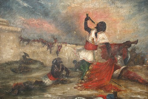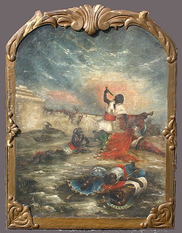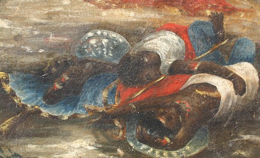 MOORISH? BATTLE SCENE O/C, 19TH C. OR EARLIER: 42 1/2'' x 33'', no visible signature. Sold as is.