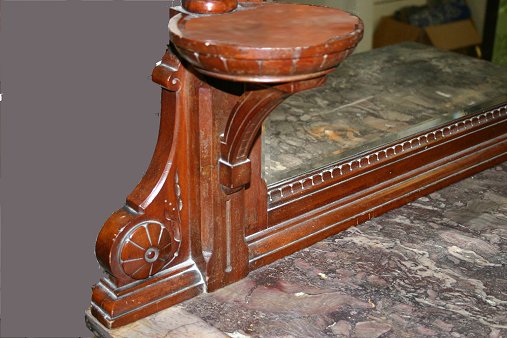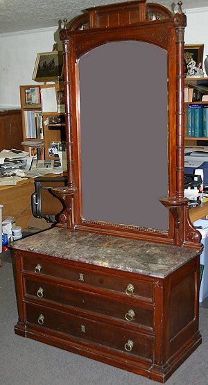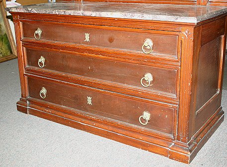 RENAISSANCE REVIVAL VICTORIAN MARBLE DRESSER: Tall mirror featuring bamboo carved stiles, the rouge marble over three full length drawers. Approx. 7' tall, 45''w. x 21'' deep.