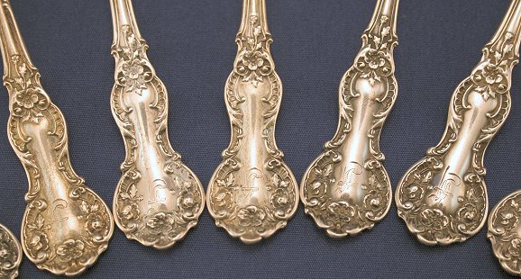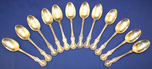 12 GORHAM ''FLEURY'' STERLING SPOONS: Set of 12 tablespoons, 7''l, monogrammed F.