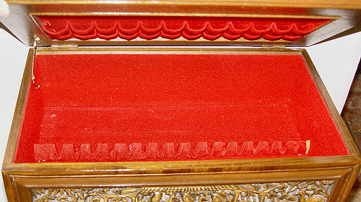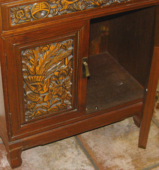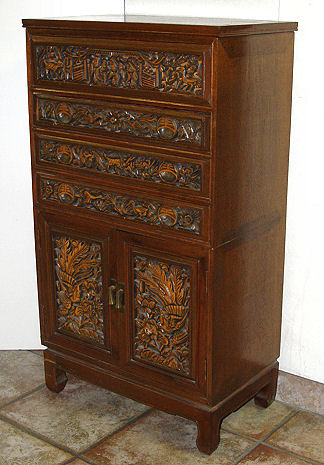CHINESE CARVED FLOOR STANDING SILVER STORAGE CHEST: Lift top, three drawers and cabinet doors at the base, the front is carved with the handles carved into the design. 38''h. x 21 1/2'' x 12 1/4''.