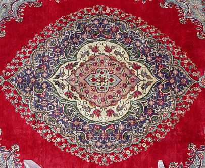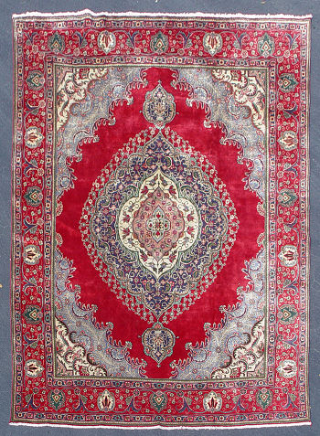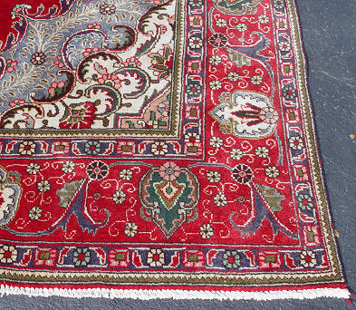 HAND KNOTTED TABRIZ CARPET: Approx. 9'5'' x 13', vibrant red ground, hand knotted in Iran.