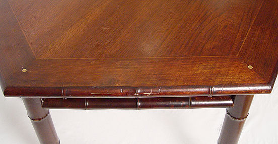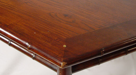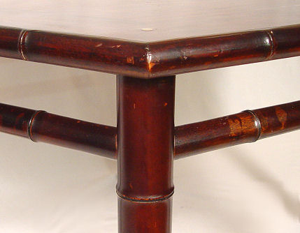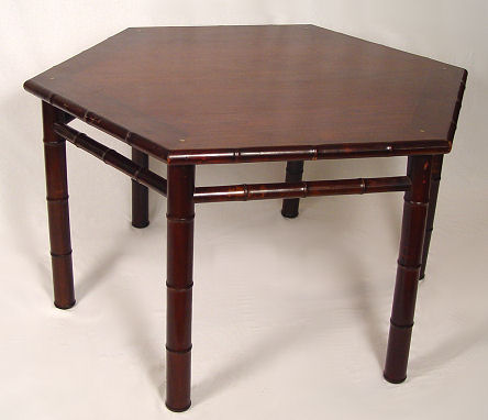 BAMBOO CARVED MAHOGANY CHINESE CHIPPENDALE GAME OR DINING TABLE: Sextagonal shape, carved bamboo legs and rim. 30''h. x 46 1/2'' dia.