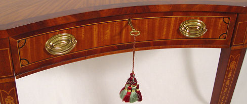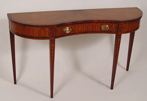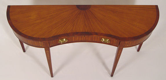 INLAID MAHOGANY DEMI-LUNE HALL TABLE: Sunray veneer top, tapered hepplewhite style legs, 28 1/4'' h x 50'' x 14'' d. Later 20th C.
