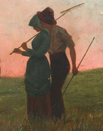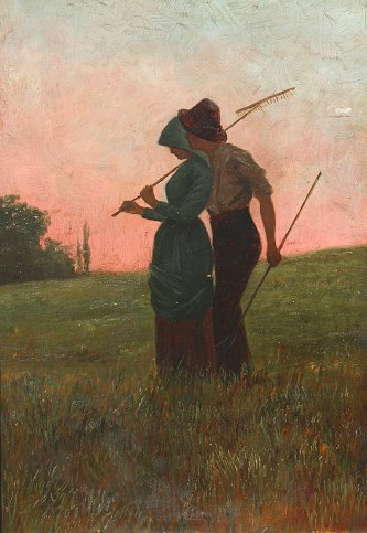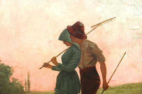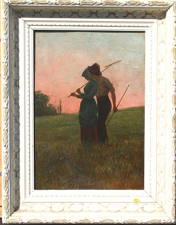 ''THE DAYS END'', ROMANTIC OIL/B CIRCA 1900: 20'' x 14'', unsigned, painted white frame, 27'' x 21''.
