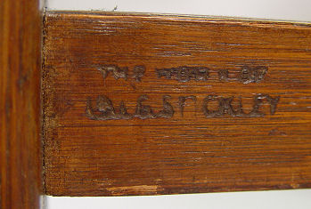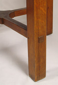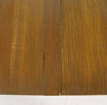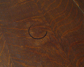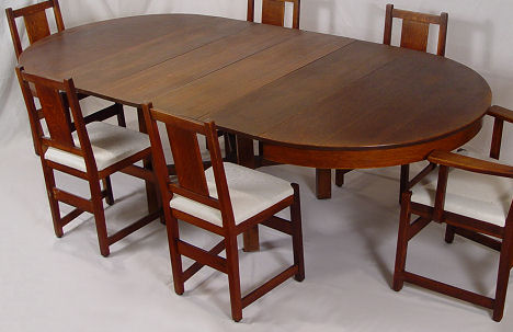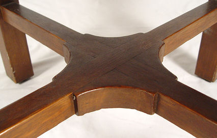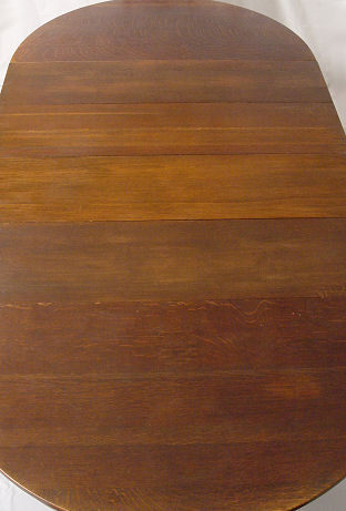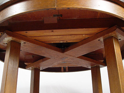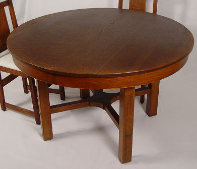 SIGNED L&JG STICKLEY DINING TABLE 722 WITH 4 LEAVES: Round table top, cross stretchers, thru tenon construction, original finish, signed with Stickley brand. 48'' dia. with 4 leaves, 12'' each. With leaves total oval length is 96'', 29 1/2'' h. Est. $1200/1400**