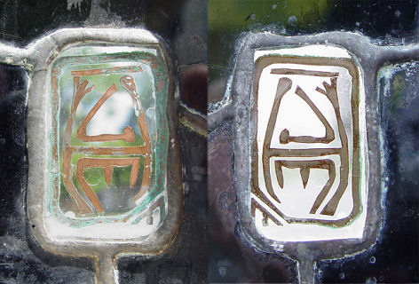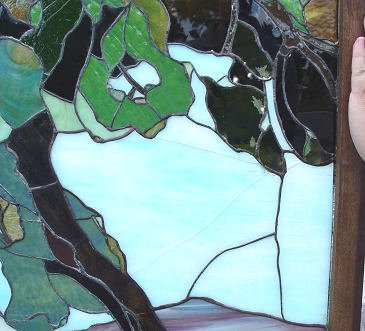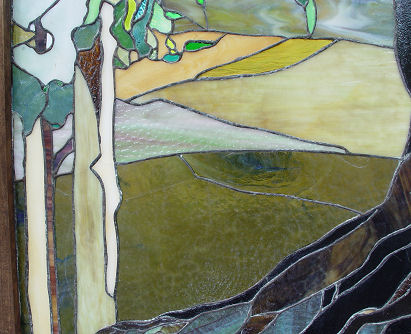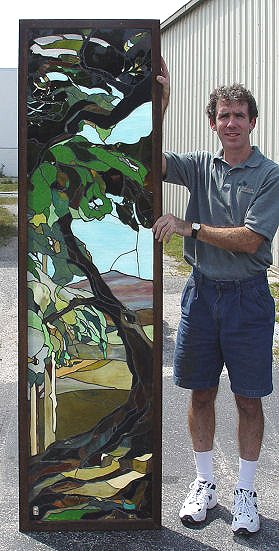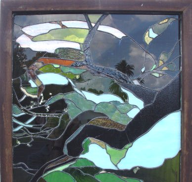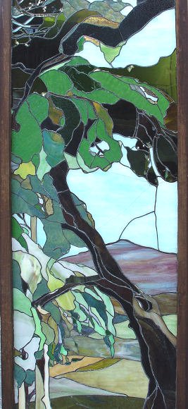 ARTIST SIGNED STAIN GLASS WINDOW: Lovely luminous dimensional arts and crafts landscape window, please note cracks and fading in mirror glass, 77 1/2'' X 22 1/4''. High quality materials to include yogohaney glass, water glass, kokomo, German glass, in wood frame. Reminiscent of Frank Lloyd Wright.