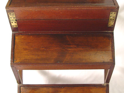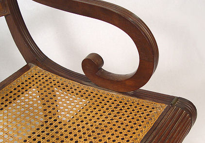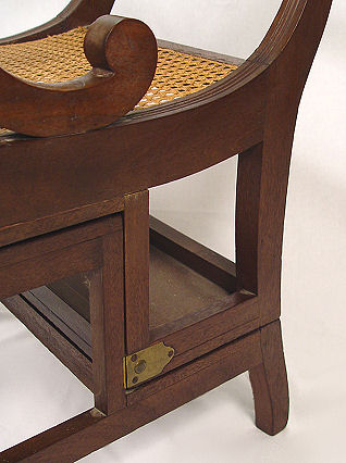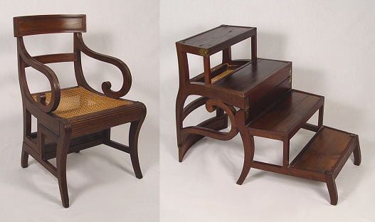 REGENCY MAHOGANY METAMORPHIC LIBRARY CHAIR: The hinged seat falls forward to form four steps, the highest being 28''. Reeded frame with caned seat, scrolled arms. In chair form 36''h. x 22'' x 19''.