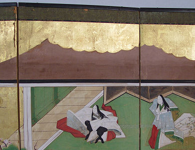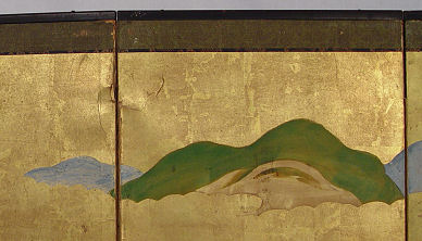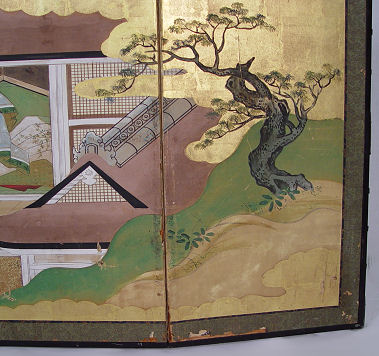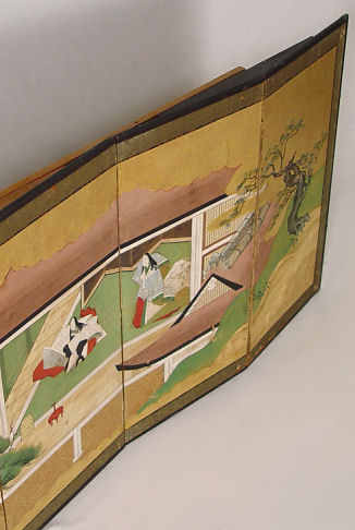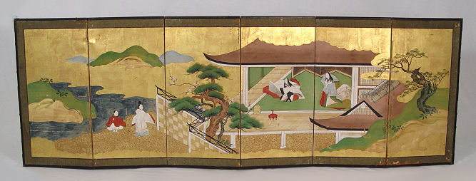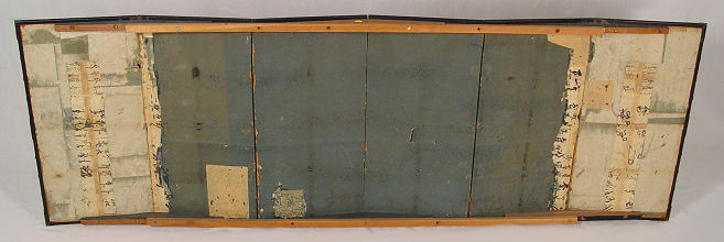 ORIENTAL 6 PANEL SCREEN: Painted on paper, the screen has been mounted on a pine frame, some tears to paper, screen has been with the consignor's family since 1880's. 71'' long x 24''h.