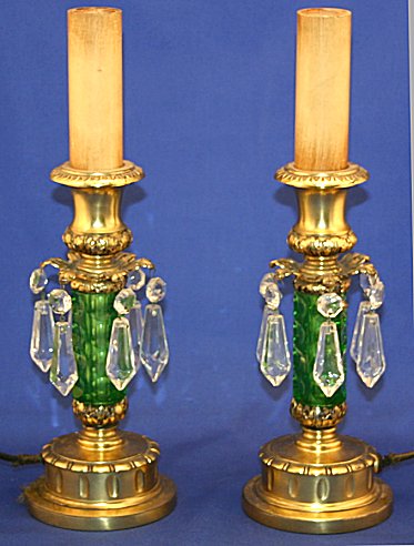 PAIRPOINT BOUDOIR LAMPS: Cut green glass crystal stems, with 6 crystal prisms, 13 1/4'' h., marked Pairpoint Quadruple Plate, wear to gold plating, need rewiring.