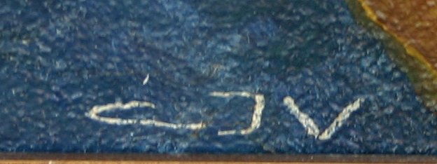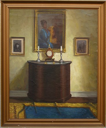 GOOD INTERIOR SCENE CIRCA 1930 O/C: 28'' x 23'', monogramed LR CJV, gold gilt frame with wear, 32'' x 27''.