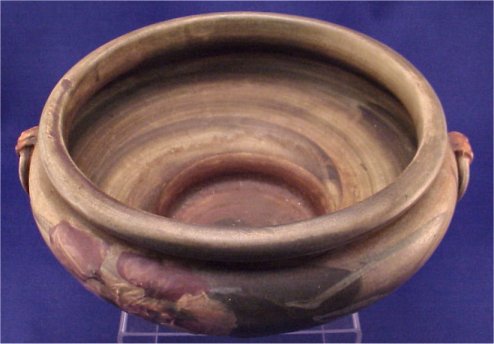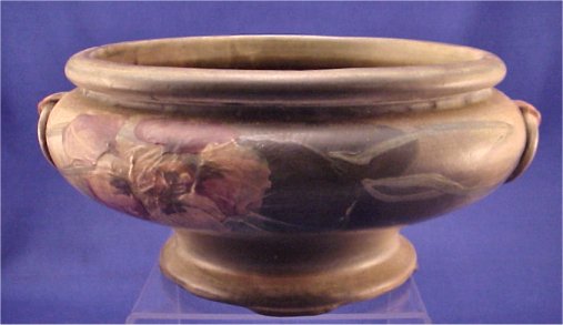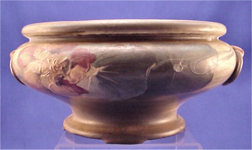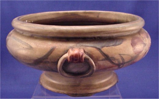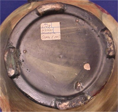 WELLER HUDSON COPRA VASE, CA 1915: Squat double handle vase, green swirl ground with lily pad decoration. Approx. 10'' dia, 4 1/2''h.
