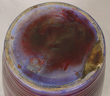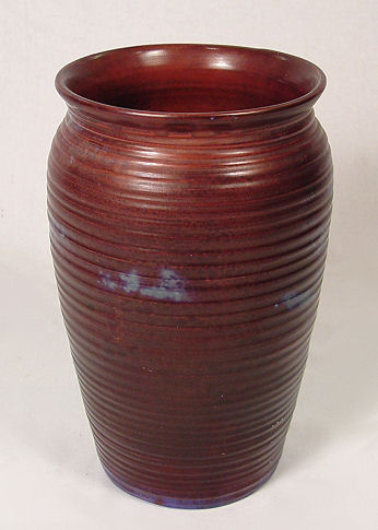LARGE MOORCROFT RIBBED VASE: Burgundy with faint underglaze decoration, 15'' h., impressed mark, repair to chip on base.