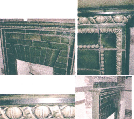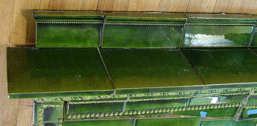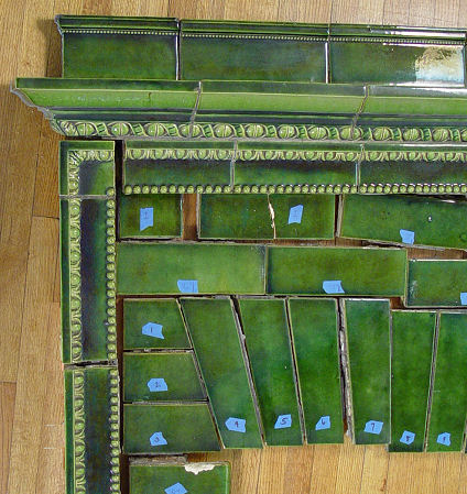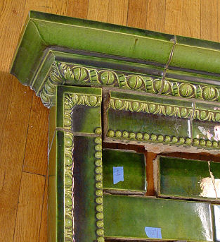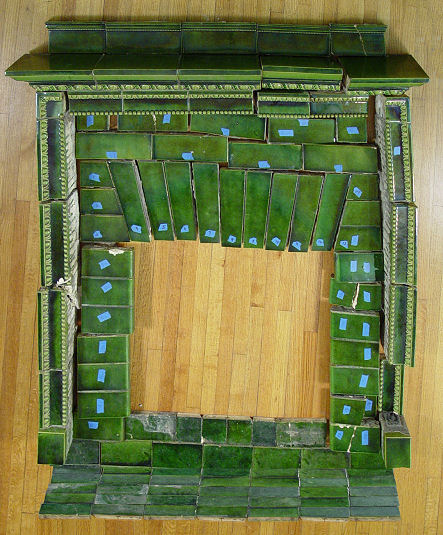 GREEN MAJOLICA GLAZE TILE FIREPLACE MANTLE AND SURROUND: Taken down piece by piece from a northern home. The blue dots shown in the photo are numbered. We also show some older photos of the mantle assembled before salvaged from the home. Nice generous mantle shelf is approx. 62 1/2''l x 10 1/2'' deep. Entire fireplace stands 57 3/4''h, add 5'' more for backsplash. Opening is 30'' x 29''. Also there are the tiles for the hearth. There was damage to several pieces, though the main